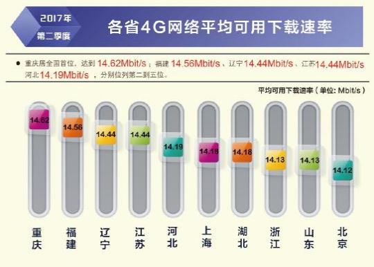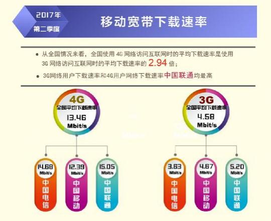 根據(jù)本次報告,除西藏自治區(qū)外,全國其他所有省級行政區(qū)域固定寬帶平均下載速率均超過 12Mbit/s,上海、北京、遼寧率先超過或達(dá)到了 15Mbit/s,位列全國前三,山東、江蘇緊隨其后。在直轄市和省會城市固定寬帶下載速率排行榜上,上海、北京、濟南、天津、福州位居前五位。從移動寬帶網(wǎng)速狀況看,重慶、福建、遼寧、江蘇、河北的 4G 網(wǎng)絡(luò)用戶下載速率排在全國省級行政區(qū)前五位;不同電信運營企業(yè)中,中國聯(lián)通的 3G 網(wǎng)絡(luò)用戶下載速率和 4G 網(wǎng)絡(luò)用戶下載速率均最高,分別達(dá)到 5.20 Mbit/s 和 15.05 Mbit/s。